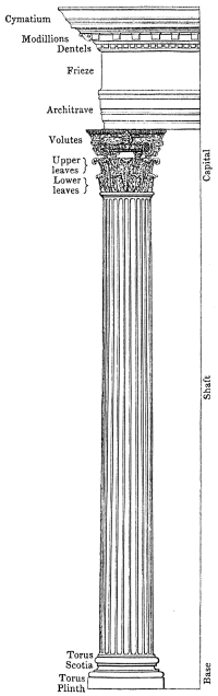 Entablature.—The architrave is generally divided into three faciæ, (the lower one much narrower than the others, which is rather contrary to architectonic principle, the weaker member being placed under heavier ones,) with mouldings between them, which, though frequently left plain, are properly enriched in the best and most [Pg 61] consistently finished-up examples. We pass over the frieze, that being merely a single surface, either plain or sculptured. The cornice is very much larger than in the other Orders,—larger as to height, and consequently as to projection also; which increased height and projection, and we may add, increased richness, are demanded by the greatly enlarged bulk of the capital and its more elaborate decoration. Examples vary so greatly that we can give only approximating mean and average proportions, which may be set down at about 2 diam. 12' for the whole entablature, and 54', or something less than a diameter, for the cornice; but it is in many instances more, in others as much less. As may be supposed from this greatly increased depth of the cornice, it consists of a greater number of mouldings beneath the corona, for that and the cymatium over it invariably retain their places as the crowning members of the whole series of mouldings. To the dentels of the Ionic cornice is added a row of modillions, immediately beneath and supporting the corona. These modillions are ornamental blocks, curved in their under surface somewhat after the manner of the letter S turned thus [symbol]; and between them and the dentels, and also below the latter, are other mouldings, sometimes cut, at others left plain. Sometimes a plain uncut dentel band is substituted for dentels; sometimes, in simpler cornices, that is omitted altogether, and plainer blocks are employed instead of modillions; or else both dentels and modillions are omitted, as in the Temple of Antoninus and Faustina, notwithstanding that it is considerably enriched, even the face of the corona being fluted.