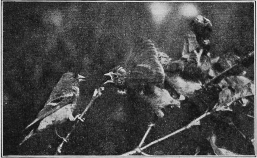 One day all this was changed. Instead of going into their little home with provisions, both Father and Mother Wren stayed out on the edge, and held a worm or a bug where the little ones could see it. After a while, one of the baby birds came up a little way to receive a helping of the food. But the big outdoors must have frightened him; for he ducked right down again. The next one that came out had more courage, or else he was more hungry. He received a helping; then gazed about him a little. Evidently the world looked pleasant to him. He shook his feathers, flapped his wings, and didn’t go back into the little home at all. This was just what Father and Mother wanted him to do, and each gave him a 6 whole worm, although the birdies inside were calling for some too.