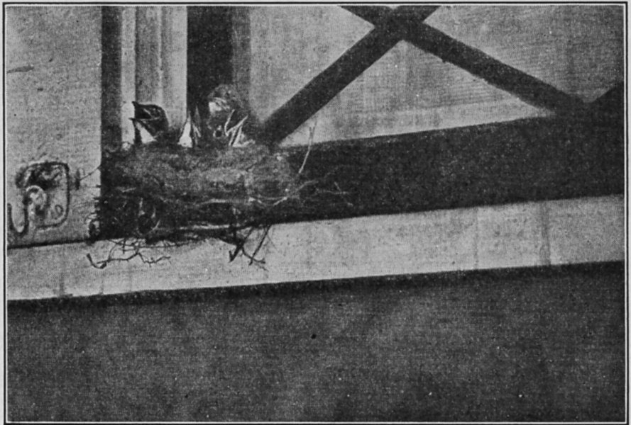 My robins, meanwhile, had made themselves a nest on a high window sill at the far end of the porch; but not until the wrens began nesting did I discover it. Already there were three blue eggs in it. The robins seemed so distressed at being found out that we kept away from that end of the porch until they got well used to us. The wrens didn’t fear us at all. They came to their nest no matter how many people were on the porch.