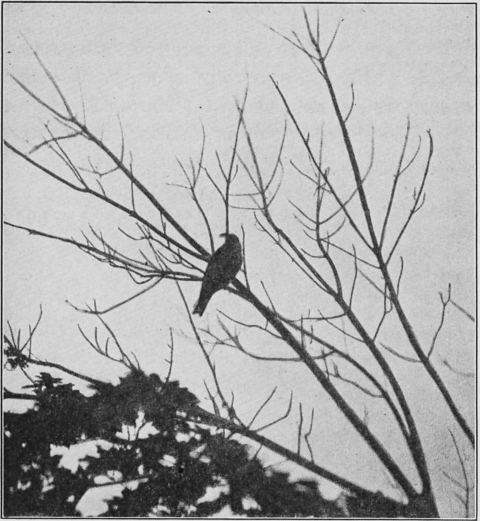 One winter day a beautiful blue and white pigeon with rose-colored neck came in at an open window. The streets were covered with snow. It was hard for birds to find anything to eat. This pigeon ate some rolled oats that I scattered before it, drank some water, and walked into a corner. After a nap it ate some more; then took another nap. When it awoke again I set it in a waste-paper basket by the open window, so it could go away when it pleased. It took several more helpings of oats. Toward evening it flew away.
