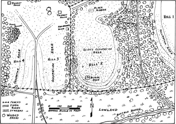 Hill 2 is higher, about 20 feet above the old lake bed, and slopes rather sharply southward to the lowlands. The top is gently rounded and had been put into cultivation only a few years before our first visit. The topsoil was very dark and many large pottery sherds were found; in fact, this hill showed the heaviest occupation of the site, over an area of 20 to 30 acres. The burials (Fig. 3) which are described later occurred on the crest of this hill, immediately overlooking the old lake.