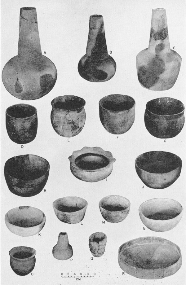 Fig. 4. Pottery From Burials. A, B, Smithport Plain bottles, V-104, 95. C, Hickory Fine Engraved, V-96. D-G, Kiam Incised jars, V-106, 133, 94, 134 (note plain body on D, vertical incising on E, fingernail punctating of F, G). H, Davis Incised, V-130. I, Untyped, V-105 (plain body, scalloped rim with free punctations on lower surface). J, Smithport Plain bowl from Allen Site. K-N, Smithport Plain bowls, V-99, 667, 668, 100. O-P, Smithport Plain miniatures, V-97, 152. Q, Wilkinson Punctated (pinched miniature), V-669. R, Smithport Plain carinated bowl, V-101.