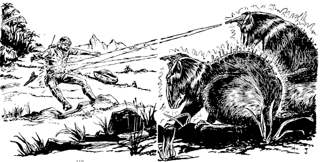 "He shook his head. 'I don't quite know,' he answered. 'I landed the life craft in this spot, picked a quantity of an unknown deep red fruit, and was just trying it out in a dish to which I thought it would be suitable, when I discovered that I was surrounded by a number of large purple animals. They looked threatening. I managed to call 'Help!' into the receiver, and then I was knocked unconscious. Stunned.
