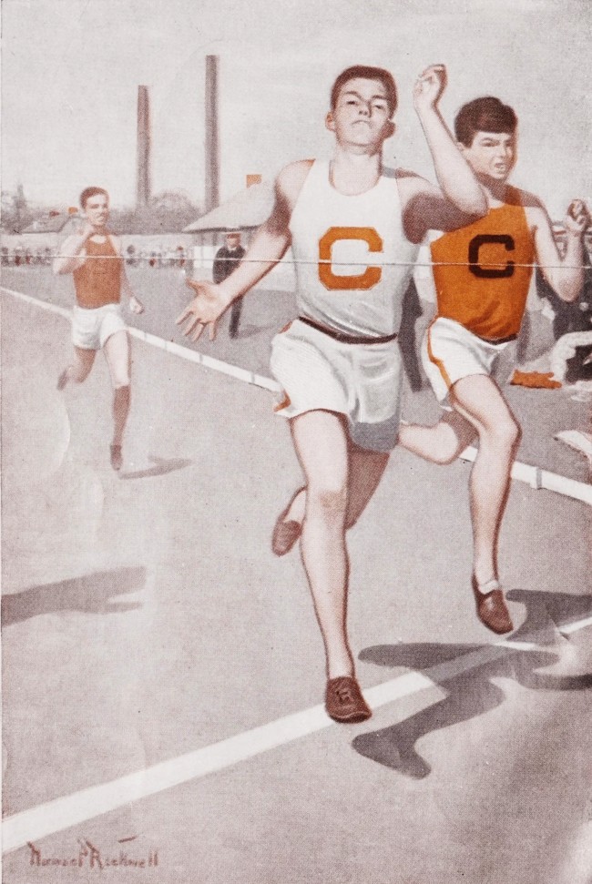 Now it was half-distance, and Perry saw the white figure at his right fall back and felt rather than saw another form crawling up and up on the other side near the rim. Lawrence held on, too, and fifty yards from the finish Perry, Lawrence and Gedge were neck-and-neck, with Kirke a single pace behind. Soper and Knight were already beaten. Then Gedge forged ahead and the wild shouts of the Springdale contingent took on new vigor. Cries of “Clearfield! Clearfield!” “Springdale! Springdale!” filled the air. Dimly, Perry heard his own name over and over.