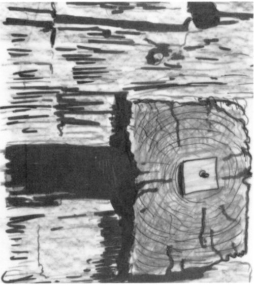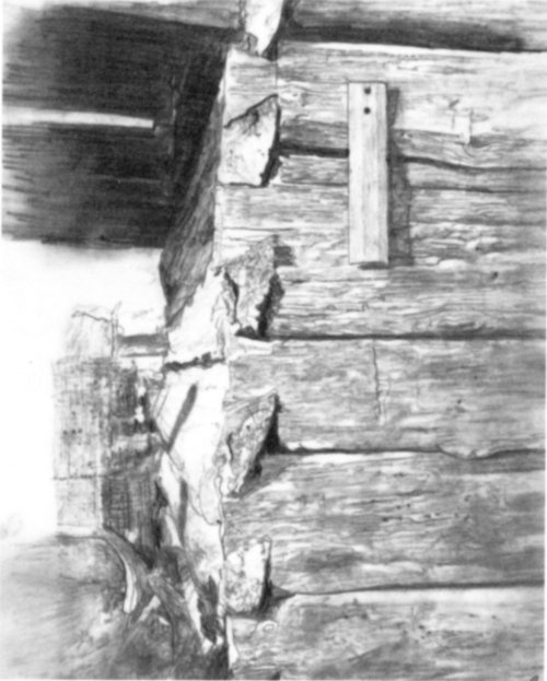 Pictured on this page are examples of log construction. In figure 4 the logs were split; the inner room wall surface would be even. In figure 5 may be seen several elements of folk log house construction in the drawing of a house being dismantled. This dogtrot with open passage between pens had an attached porch, square logs with square notches, an end exterior chimney (base visible), three inch round pole roof rafters and gallery door openings with the head occurring at the seventh log. In figure 6 a close-up detail shows the square hewn logs and square notches on this dogtrot.