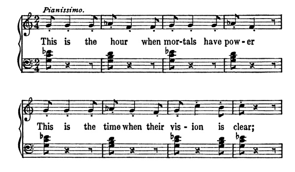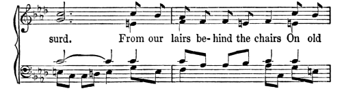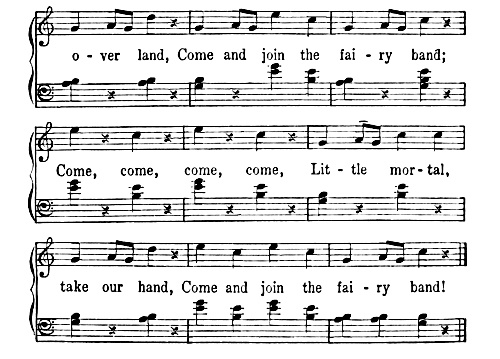 [Fairy touches him with wand. He stands up, stretches himself, then sits on his little stool and sings:]