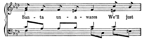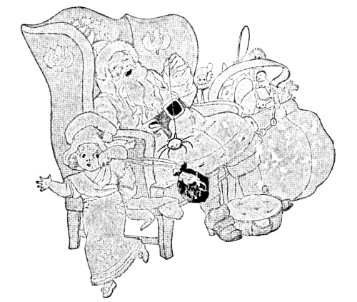[In the bed at center the Maiden lies asleep in her little frilled night cap and gown. Her stocking is hung on the bedpost. At the left on a small table a tiny candle burns.