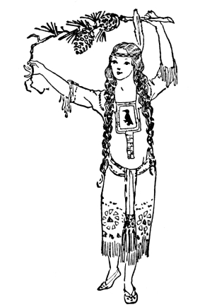 The woods in winter. If scenery is not available, a generous supply of white sheets and cotton batting will make an effective setting, with a few small evergreens, and bare boughs. A large Christmas tree should be utilized as part of the scene; place it to right of center, and trim lightly with silver tinsel, “snow,” and glass icicles. Near the tree, a couch or seat should be built up and covered with white, to represent a little mound; upon this the Queen sits, and later, the children recline. The time is about sunset; a red light, if available, will be effective early in the scene, while toward the end it grows darker. A curtain is not absolutely necessary, although of course more “like a play.”