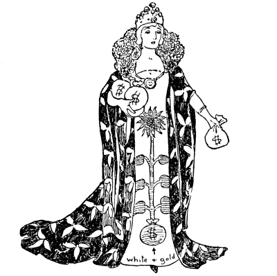 The Queen and her Fairies are in white, with silver tinsel and crystal ornaments, and carry wands with silver stars. They may wear either trailing draperies, or short “Pierrette” dresses, with silver ruffs, rosettes, and little pointed caps.