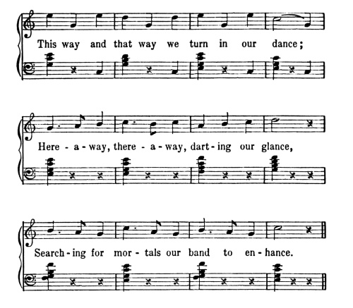 [The Queen and Fairies enter, dancing, to the air of “Come, Lasses and Lads.” The Holly Elves dance in from opposite side, and, with the Fairies, form a circle about the Queen, singing:]