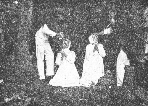 [The Queen seats herself upon the mound as a throne, while the rest group themselves about her. Crystal, Pearl, and several others step to left, looking off intently, as though something attracted their notice.]