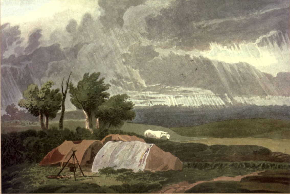 The clouds, indigo and Indian red, finished with indigo and lake, and a few touches of light red, subdued with a little indigo on the edges of the clouds; the distance, with the same grey colour as the clouds; the bright greens, burnt sienna, indigo, and gamboge, glazed with Vandyke brown; the gipsey tents are lightly coloured with lake and a little black, and varied with a few clear tints.