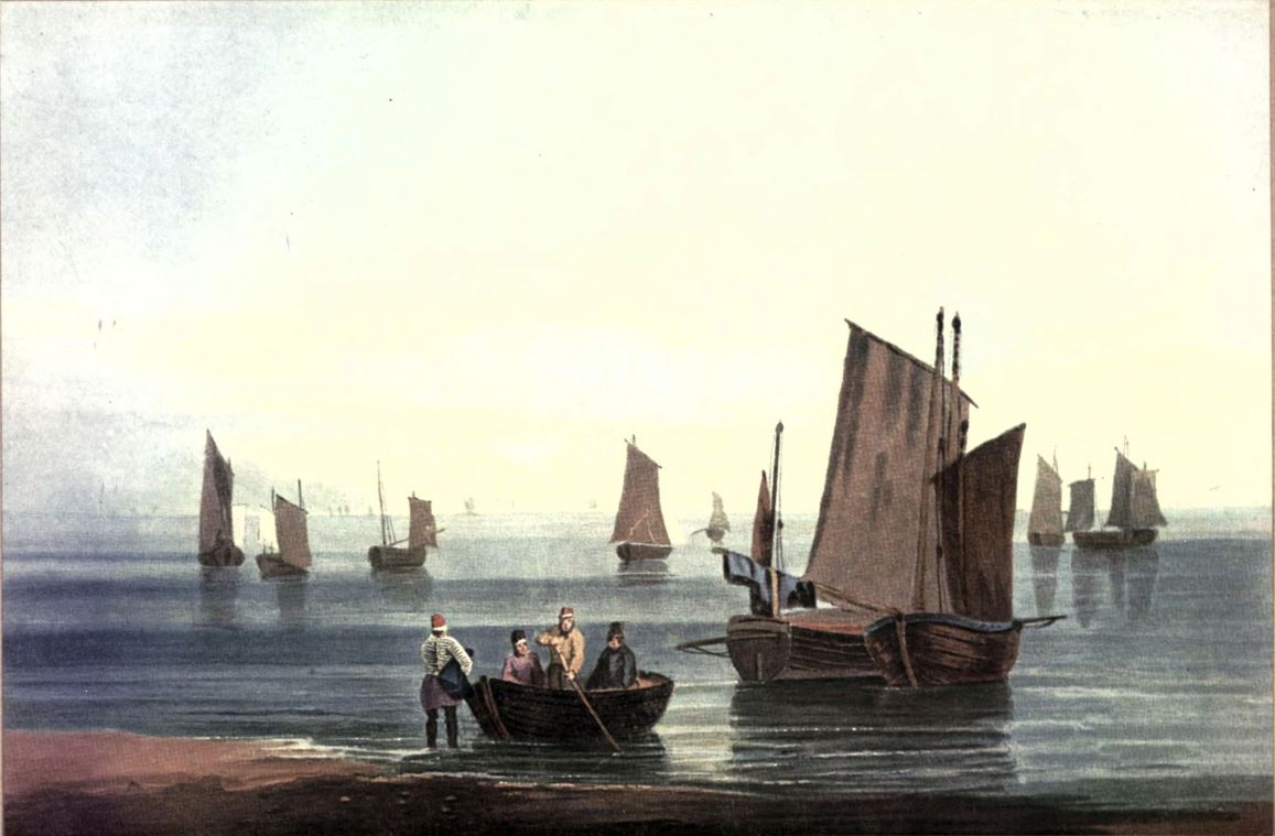 The blue sky is coloured with indigo and a little lake; the clouds, with indigo and Indian red; the sea, indigo, gamboge, and a little lake; the boats, sails, etc., with a grey tint of indigo and Indian red mixed, glazed with Vandyke brown and burnt sienna; the figures shaded with the same grey as the boats, and coloured as may be required.