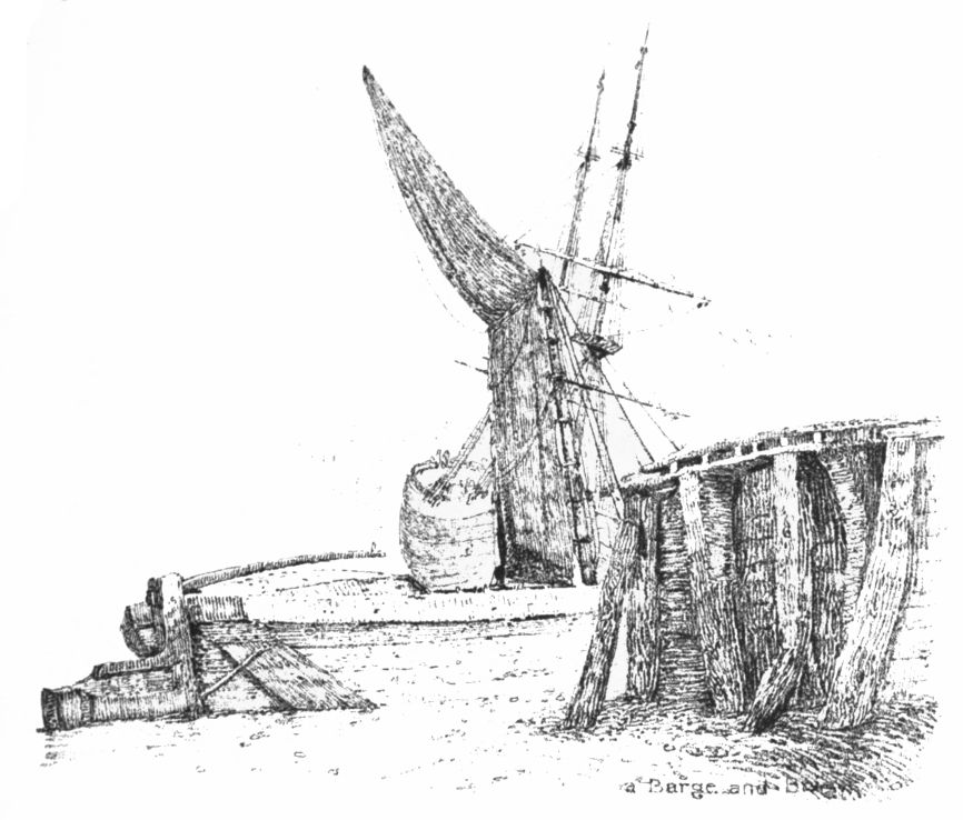 The blue in the sky with indigo and lake, subdued with a little gamboge; the clouds tinted with light red and indigo mixed; the distance, water, trees, etc., worked in with a grey composed of indigo, lake, and gamboge, and glazed with brown pink; the barge, with a clear tint of lake and black, glazed with Vandyke brown, finished with a few smart touches of the same.