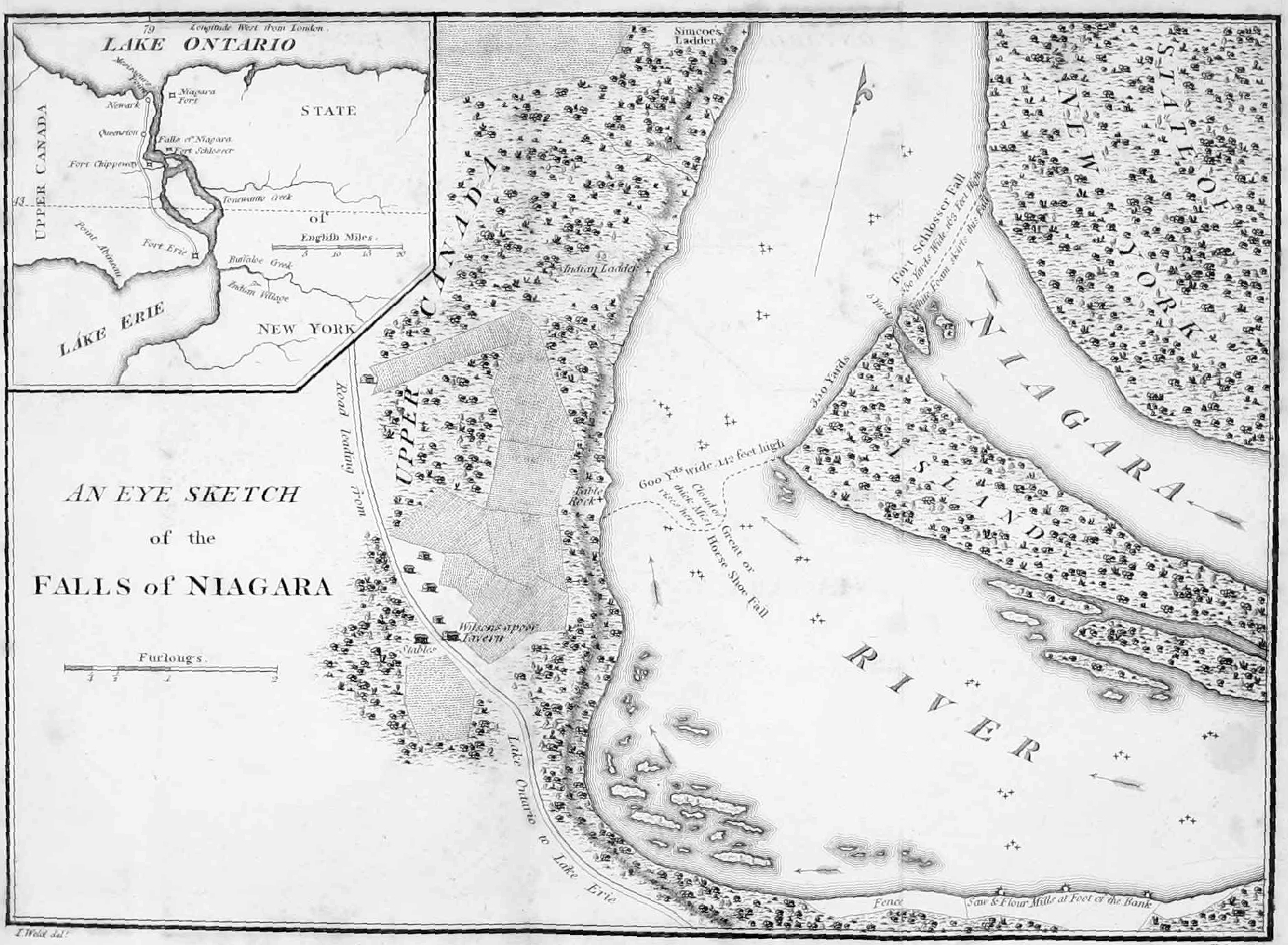 At an early hour we pursued our voyage, and before noon passed the last rapid, about three miles below the mouth of Oswegatchee River, the most considerable of those within the territory of the United States, which fall into the St. Lawrence. It consists of three branches, that unite together about fifteen miles above its mouth, the most western of which issues from a lake twenty miles in length and eight in breadth. Another of the branches issues from a small lake or pond, only about four miles distant from the western branch of Hudson’s River, that flows past New York. Both the Hudson and Oswegatchee are said to be capable of being made navigable for light bateaux as far as this spot, where they approach within so short a distance of each other, except only at a few places, so that the portages will be but very trifling. This however 48is a mere conjecture, for Oswegatchee River is but very imperfectly known, the country it passes through being quite uninhabited; but should it be found, at a future period, that these rivers are indeed capable of being rendered navigable so far up the country, it will probably be through this channel that the chief part of the trade that there may happen to be between New York and the country bordering upon Lake Ontario will be carried on. It is at present carried on between that city and the lake by means of Hudson River, as far as Albany, and from thence by means of the Mohawks River, Wood Creek, Lake Oneida, and Oswego River, which falls into Lake Ontario. The harbour at the mouth of Oswego River is very bad on account of the sand banks; none but flat bottomed vessels can approach with safety nearer to it than two miles; nor is there any good harbour on the south side of Lake Ontario in the neighbourhood of any large rivers. Sharp built vessels, however, of a considerable size, can approach with safety to the mouth of Oswegatchee River. The Seneca, a British vessel of war of twenty-six guns, used formerly to ply constantly between Fort de la Galette, situated at the mouth of that river, and the fort at Niagara; and the British fur ships on the lakes used also, at that 49time, to discharge the cargoes there, brought down from the upper country. As therefore the harbour at the mouth of Oswegatchee is so much better than that at the mouth of Oswego River, and as they are nearly an equal distance from New York, there is reason to suppose, that if the river navigation should prove equally good, the trade between the lakes and New York will be for the most part, if not wholly, carried on by means of Oswegatchee rather than of Oswego River. With a fair wind, the passage from Oswegatchee River to Niagara is accomplished in two days; a voyage only one day longer than that from Oswego to Niagara with a fair wind.