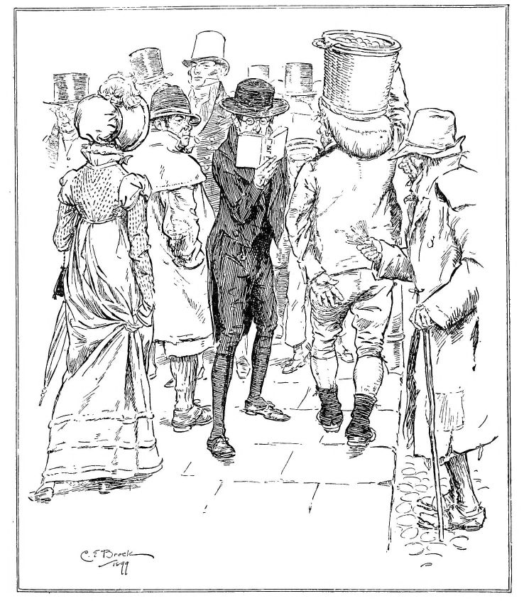 A very charming phase of book-illustration followed close upon this great black-and-white period, and it was a phase of colour. The flat wood-block process was developed by the late Edmund Evans, the colour-printer, and, encouraged by him, three gifted artists of severally distinctive styles exploited its possibilities with distinguished and popular success. Randolph Caldecott, Kate Greenaway, and Walter Crane—their very names call to mind a captivating series of picture-books in which their fancies made dainty frolic and revel for the delight equally of children and grown-ups. With all three the fairy tale and the nursery rhyme found fresh graces of pictorial expression and vivacities of invention, and the children’s picture-book entered upon a new era of artistic refinement and charm. Of the veteran Walter Crane, and his influence on the decorative side of book-illustration, one must speak presently, for happily he is represented in this volume. Of Randolph Caldecott and Kate Greenaway, what is there fresh to say in appreciation? Who has not laughed and rejoiced over Caldecott’s “John Gilpin” and his inimitable Goldsmith and Washington Irving illustrations, with their breezy humour, their happy, lively art? Is it only the middle-aged children who recall affectionately the dainty pictorial graces of Kate Greenaway’s world of little people? Anyhow, her very name has become almost established as an adjective. The sweet, tender simplicity of the colour-schemes of those books of Caldecott’s and Kate Greenaway’s had an unforgettable fragrance, and one may feel that without the influence of these artists many of the children’s books of to-day might perhaps lack something of their charm.