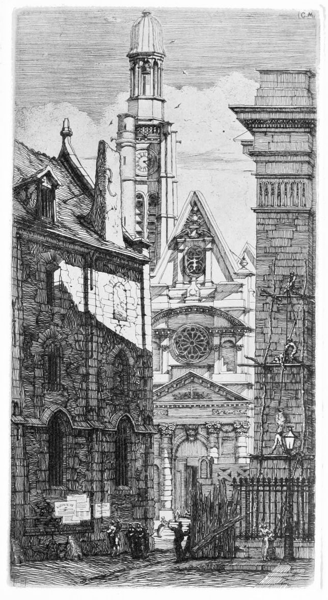 La Tour de l’Horloge (plate 11) was drawn and etched in 1852 while alterations were in progress which materially altered the appearance of Le Châtelet. This plate has always struck me as being a very straightforward and masterly portrait of a building, but without so much personal expression as Meryon generally contrived to impart to his other etchings. An edition of 600 copies of Delteil’s sixth state was published in L’Artiste in 1858, and it was only after this large edition had been struck off that Meryon made a rather important change in the plate, which appears in the last two states, by making rays of light issue, somewhat unaccountably, from the windows between the high square tower and the first of the round ones. Tourelle de la rue de la Tixéranderie (plate 12), also etched in 1852, was drawn just before its demolition. The etching gives a very beautiful effect of sunlight on a most picturesque old house, with the lower part of its turret wreathed in the foliage of a creeper; but the mediæval knight in helm and plumes, who rides along the street, and the nude woman standing in the doorway (in the first state) are curious additions to the scene. The latter figure was retouched in the final state. Saint-Etienne-du-Mont (plate 13), also etched in 1852, is similar in style, as in dimensions, to the last subject. It gives, again, a beautiful effect of sunlight, and the architectural details of the church are shown with an exquisite clearness. The little figures are lively and interesting, but in the state here reproduced a blemish may be noticed; the raised{15} arms of a workman on the scaffolding, near the gas lamp on the right, have been effaced, to be restored in the next state.