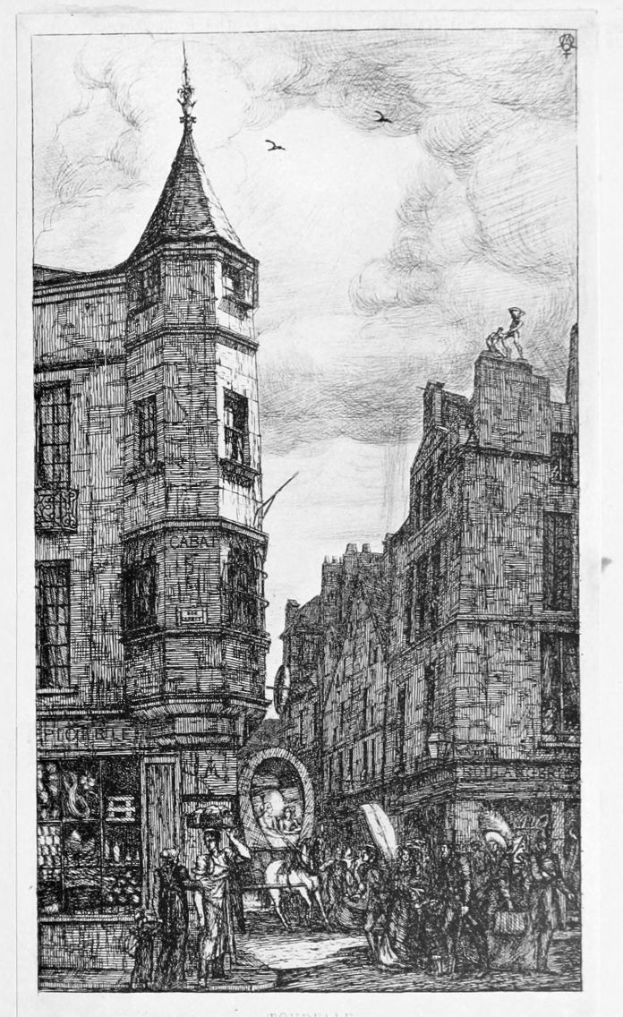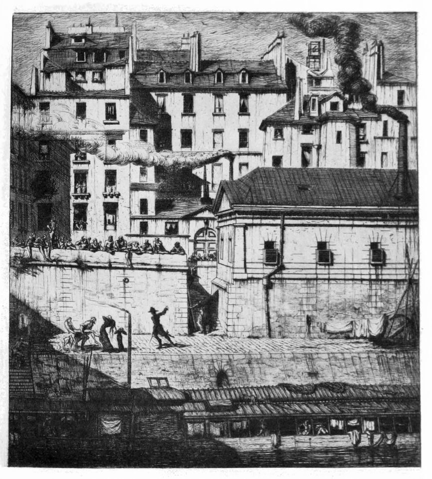 La Rue des Mauvais Garçons (plate 10), which formed the cul-de-lampe or tail-piece of the first livraison of “Eaux-Fortes sur Paris,” has always impressed modern observers as one of the most powerful and impressive of the etchings, fraught with mystery, enigmatic, suggestive of long past tragedies. “Quel mortel habitait,” are the verses etched on the building, “En ce gîte si sombre? Qui donc là se cachait Dans la nuit et dans l’ombre?” Was it Virtue, in silent poverty; was it Crime? No answer to the riddle is attempted. The street exists no longer.