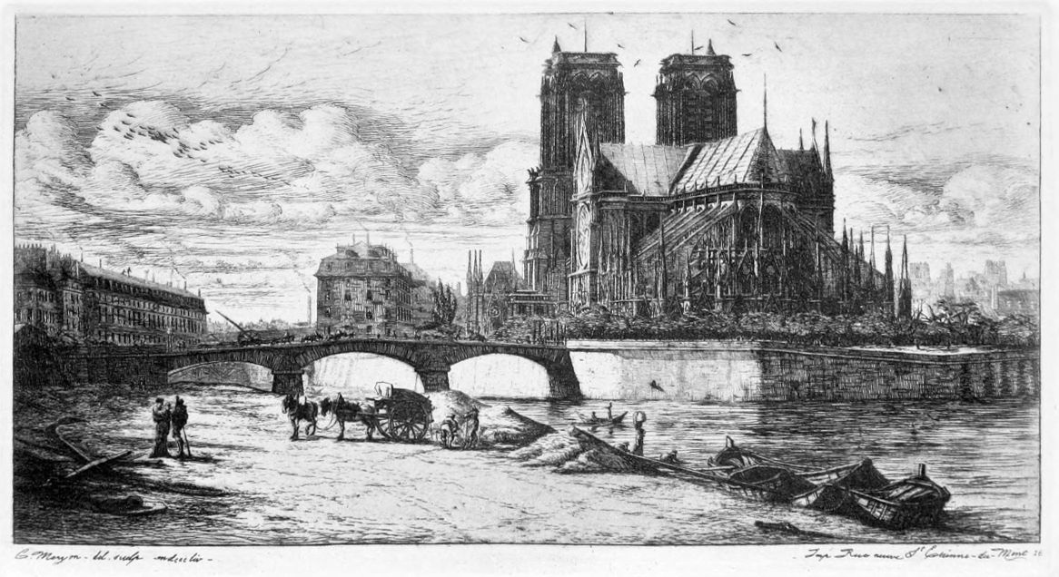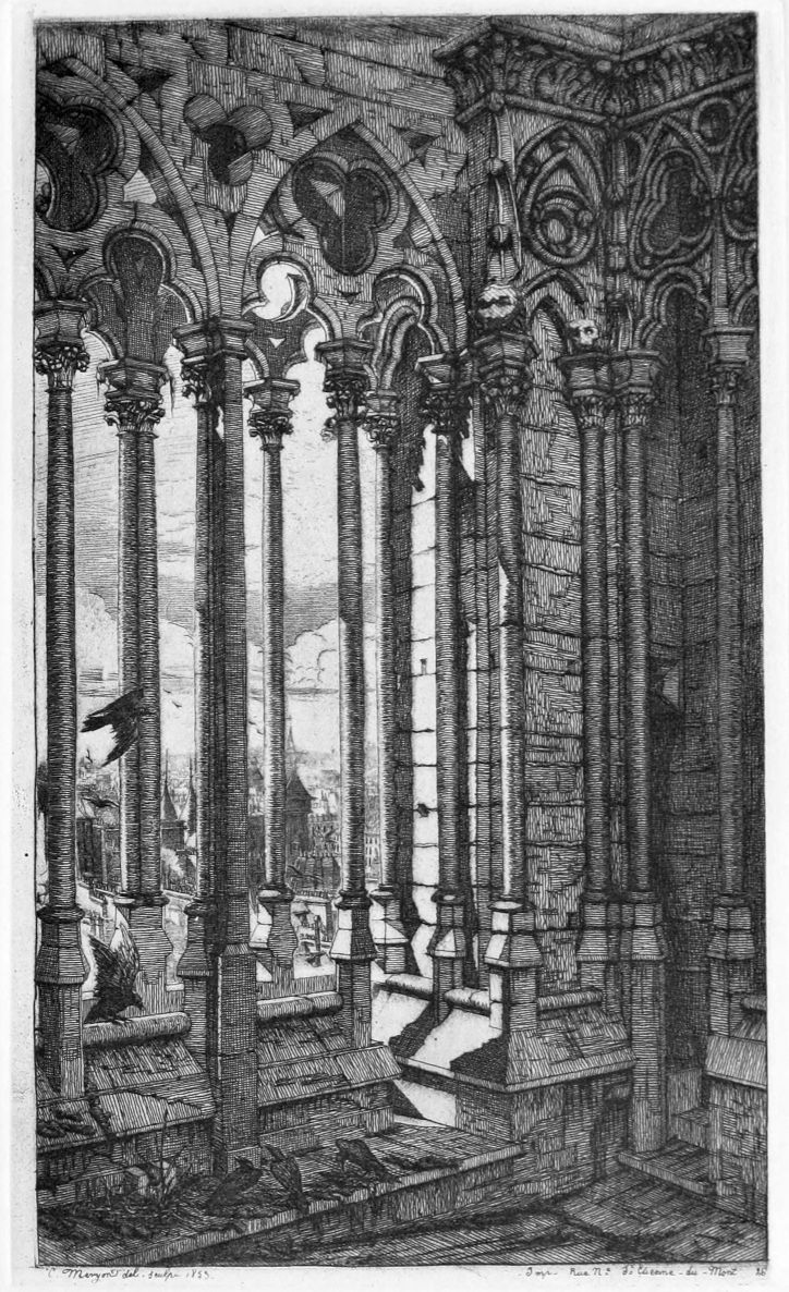 The delicacy of the work, in fine proofs, is beyond the power of any mechanical process to reproduce. Two pencil studies, formerly in the Macgeorge collection, are very interesting as showing Meryon’s conscientious method of preparation for this plate. He made one very highly finished drawing of all that is seen of the city of Paris down below, reserving blank spaces for the Stryge and for the Tour St. Jacques—there is also a trial state of the plate, showing that all this portion of the design was etched first, directly from this drawing—and then another equally finished drawing of the tower and the stone monster by themselves, with all the rest of the subject drawn in outline, probably traced from the first drawing. A drawing by Meryon of another of the monsters of Notre Dame, a monkey, with a set of verses written beside it, is reproduced in Bouvenne’s “Notes et Souvenirs.” Then follows Le Petit Pont (plate 7), in which the twin towers of Notre-Dame, beautifully placed on the plate, surmount the long rows of houses on the Quai du Marché Neuf and dominate the whole composition. The outline drawing which Meryon made from the level of the shore, showing the towers very much lower, is reproduced in M. Delteil’s catalogue. L’Arche du Pont Notre-Dame (plate 8), especially in the beautiful proofs on green paper, is one of the most charming of the whole series and free from any eccentricity. La Galerie Notre-Dame (plate 9) is a very beautiful rendering of Gothic architecture, and a most delicate study of effects of light, direct and reflected. The impressions vary much, some being rich in tone and rather veiled, others clean wiped and of a silvery clearness. The highly finished drawing which Meryon etched almost in facsimile, only adding clouds in the sky, was in the Macgeorge collection.{14}