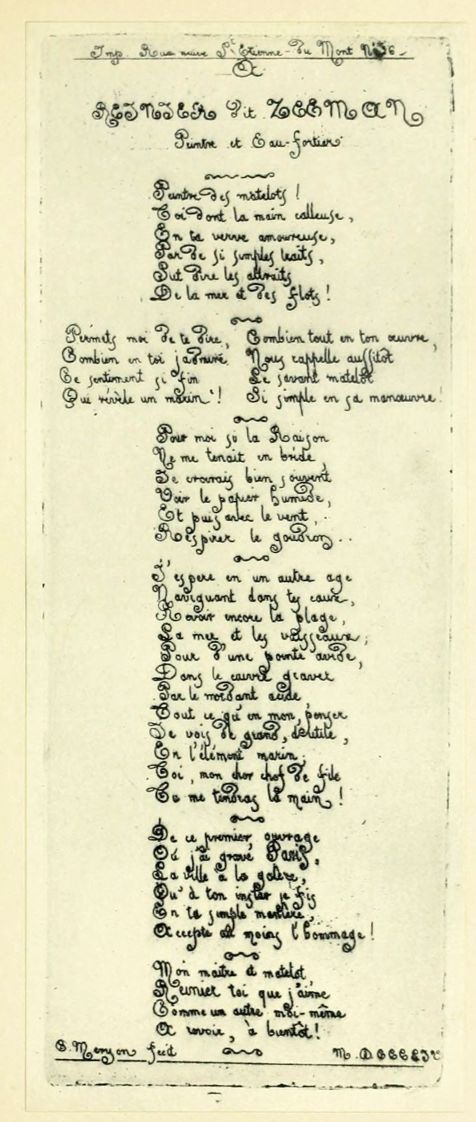 The dedication to Zeeman, “peintre des matelots” (plate 3), is in verses which express in simple language Meryon’s love and admiration for the master who had inspired his early efforts, concluding with the words:—