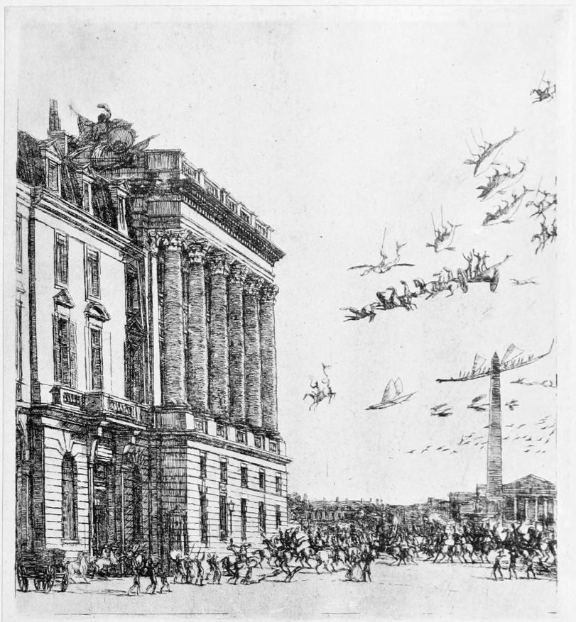 Le Pont-au-Change (plates 17, 18), etched in 1854, shows again Le Châtelet and the Tour de l’Horloge, and, beyond the bridge, the tower, with which we are now familiar, of La Pompe Notre-Dame. This etching is remarkable for the{16} many changes introduced into the sky in successive states. From the second to the sixth state of Delteil there is a balloon floating in the sky towards the left, inscribed SPERANZA (plate 17), to which the verses L’Espérance (plate 19) allude. In the seventh state this balloon disappears; in its stead there are great flights of birds across the sky, of which the lower resemble wild duck, while the upper ones, with longer wings, have got hooked beaks which make them look more like birds of prey than the jackdaws which one would expect to fly round the towers of a city. These remain (plate 18) during several alterations in the plate, until the tenth state, when they have disappeared from the left, though a concentrated flock wheels about the Tour de l’Horloge, and their place is taken by new balloons, near and distant, and in the eleventh state by still more balloons, one of which bears the name of Vasco de Gama. This is all rather crazy, and the alterations were made, like those on other plates to which we shall refer later, after Meryon’s mind had finally become deranged. This is evidently the etching referred to in a letter from Baudelaire to Poulet Malassis (quoted by M. Loys Delteil): “Dans une de ses grandes planches, il a substituté à un petit ballon une nuée d’oiseaux de proie, et, comme je lui faisais remarquer qu’il était invraisemblable de mettre tant d’aigles dans un ciel parisien, il m’a répondu que cela n’était pas dénué de fondement, puisque ces gens-là (le gouvernement de l’Empereur) avaient souvent lâché des aigles pour étudier les présages, suivant le rite,—et que cela avait été imprimé dans les journaux, même dans le Moniteur. Je dois dire qu’il ne se cache en aucune façon de son respect pour toutes les superstitions, mais il les explique mal, et il voit de la cabale partout.” This letter dates from January 1860, a few months after Meryon had been released from his first confinement in an asylum, and it must be observed that any eccentricities due to mental derangement can only be traced in plates etched subsequently to 1859, or in the late states, produced by re-touching after that date, of the “Eaux-fortes sur Paris” them{17}selves, which, as first completed in 1854, the year of this publication, had been perfectly normal.