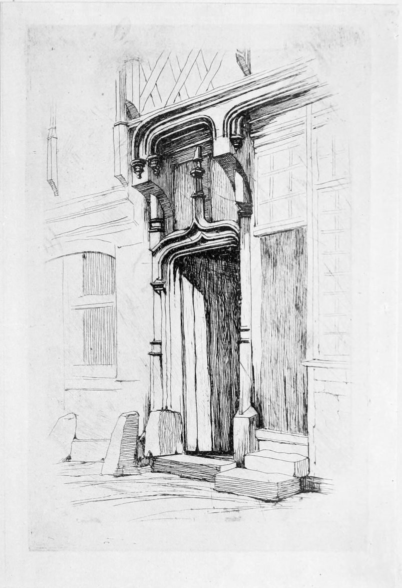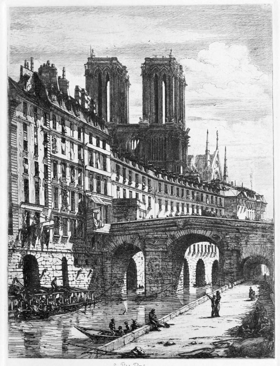 In making his studies of old houses and churches, Meryon seldom made a complete drawing on the spot. He would go every day at the same hour and make minutely finished studies of details on small bits of paper, which he either stuck together or made another drawing from them. He used an exceedingly sharp, hard pencil; the astonishing fineness of the line that he produced with it may be well seen in two early drawings of Rouen Cathedral from the Seine in the British Museum, which also possesses some of the drawings of architecture at Bourges, a place which first fascinated him on a visit made about 1848. In drawing architecture Meryon always worked upwards from the bottom of his object, saying that buildings were begun from the foundation and the artist{7} should follow the same method as the builder. In the same way he would draw men from the feet upwards, saying that they must always be planted firmly on their feet before they began to do anything. Le Petit Pont well illustrates another peculiarity of his practice in drawing architecture. He deliberately renounced any competition with the camera of the photographer, and claimed the right to arrange the different parts of what he drew in the manner best calculated to convey a certain impression, while preserving the utmost exactness in the representation of detail in each part. It has been observed, by those who know the spot well, that the towers of Notre-Dame, which dominate the whole composition, are much too high in the etching in regard to their actual dimensions and to the laws of perspective. After taking a drawing from very low down, near the edge of the water, Meryon drew the towers again from the level of the street, as the passer-by would habitually see them, and fitted this drawing with great skill into the former one, constructing by this combination a composition which produced the desired effect of impressive and majestic height, all the details being absolutely accurate, though on reflection it might be discovered that they could not all be seen at once.