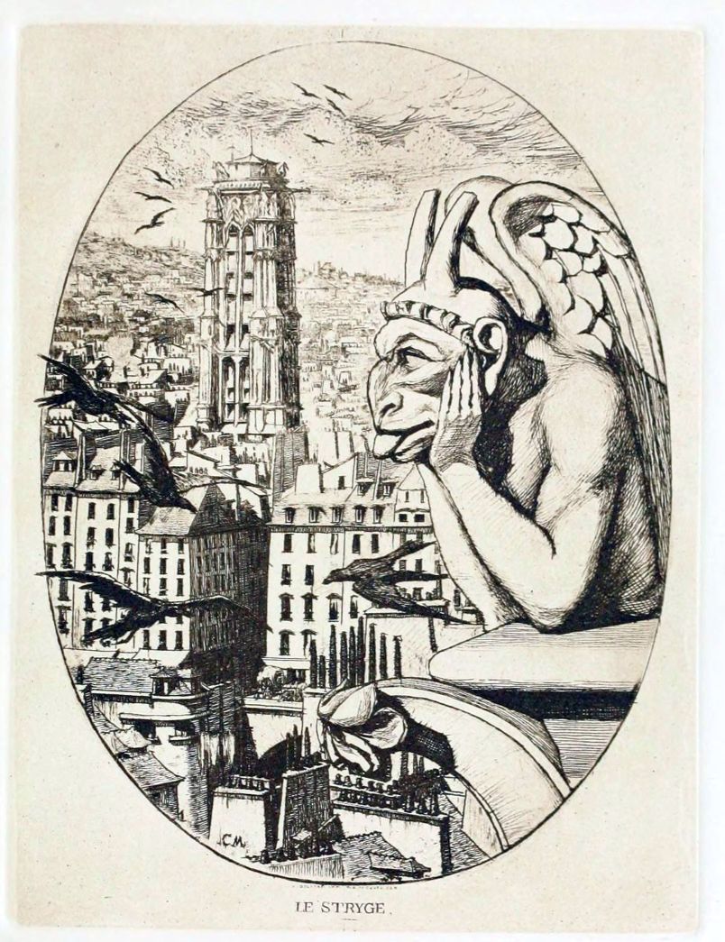 The frontispiece (plate 4), a round composition in which a devil carrying a great scroll hovers against a lurid sky over the Gothic gateway of the Palais de Justice, is a sinister design. The Tomb of Molière (plate 23), tail-piece to the set, was etched on the same plate, and a proof exists from the undivided copper containing both designs. The verses following the frontispiece are a comment on the latter, and express Meryon’s conviction that the city of Paris, “Paris le Paradis des amours et des Ris,” is possessed by a “noir Diabloton, malicieux, mutin,” fostered by science, and that this “méchant animal, Origine du mal” cannot be exorcised without razing the city to the ground. These etched verses are very rare. The symbolical coat of arms of the city of Paris (plate 5) is another of the minor pieces inserted in 1854, when the set was being completed. Then follows Le Stryge (plate 6), etched in 1853, one of the most original and impressive of all Meryon’s etchings. His elbows propped on the ledge of the balcony, one of the Gothic monsters of the western towers of Notre-Dame broods with head in hands and lolling tongue, an enigmatical and evil expression in his eye, over the city of Paris seen far below, with the Tour St. Jacques as the most{13} prominent object. Jackdaws circle in the air about the towers, and graven beneath the oval, in one state only of the plate, is the sinister couplet:—