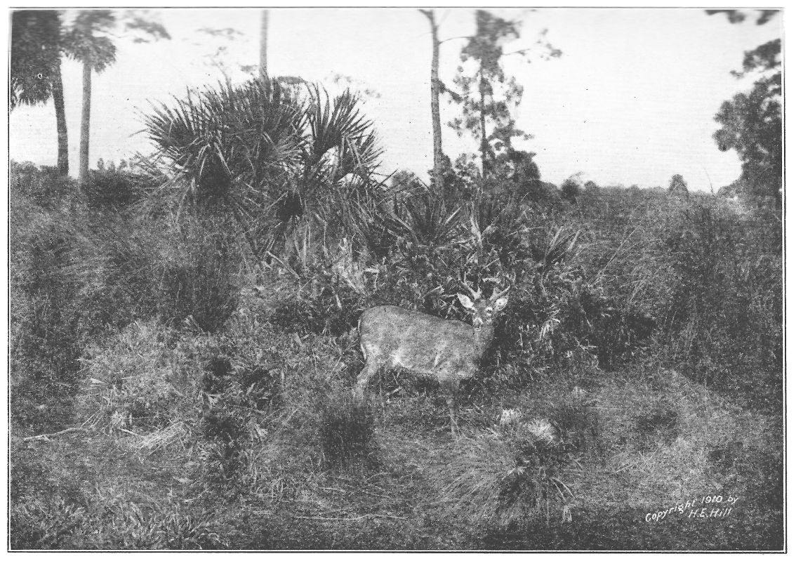 The little river steamer that takes you up the St. Johns from Jacksonville to Orange Park soon leaves the uproar of the city, the skyscrapers and drawbridges, tugs, lighters, and coastwise steamships behind, and puffs onward into placid reaches that to the eye have changed little since the days of De Soto. If plantations and villages exist ashore there is but little indication of them. The banks are lined with verdure, green and gray,—green with the foliage of century-old live-oaks and tall, long-leaved pines, gray with exquisite festoons and dangling draperies of the moss that decorates every tree and fairly smothers some of them. There is a crinkly grace, an elderly virility about it that is most engaging. It takes but little effort of the imagination to see the red cheeks and twinkling eyes of a myriad disciples of Santa Claus peering through it ready to bring gifts to all good children. I have yet to see with what costume they simulate the good saint in this country. If they do not make his beard of this softly beautiful, crinkly, fatherly gray moss I shall feel that they miss an excellent opportunity. Here{10} and there through the moss and among the big, rough tree-trunks a tiny road winds down through the needle-carpeted sand and leads to a slender long pier, built far out over the shallow reaches of the river to a landing for the river boats. The stream is miles wide in its lower course, but only in its channel is it deep. Shallows stretch far from either bank and fleets of water hyacinths voyaging seaward with the current strand sometimes far from shore. The fifteen-mile trip is thus like one into a sub-tropical wilderness untouched by the chill of approaching winter, little marred by the hand of man. The miracles of gorgeous autumn coloring which we left behind in the Massachusetts woods find no echo here. Now and then a sumac leaf shows dull crimson or the wild grape takes on a somber yellow, yet these tiny dots of color are no more to be noticed in a general survey of the forest than the bright hues of the butterflies that swarm at midday in the bright sun and a temperature of eighty in the shade.