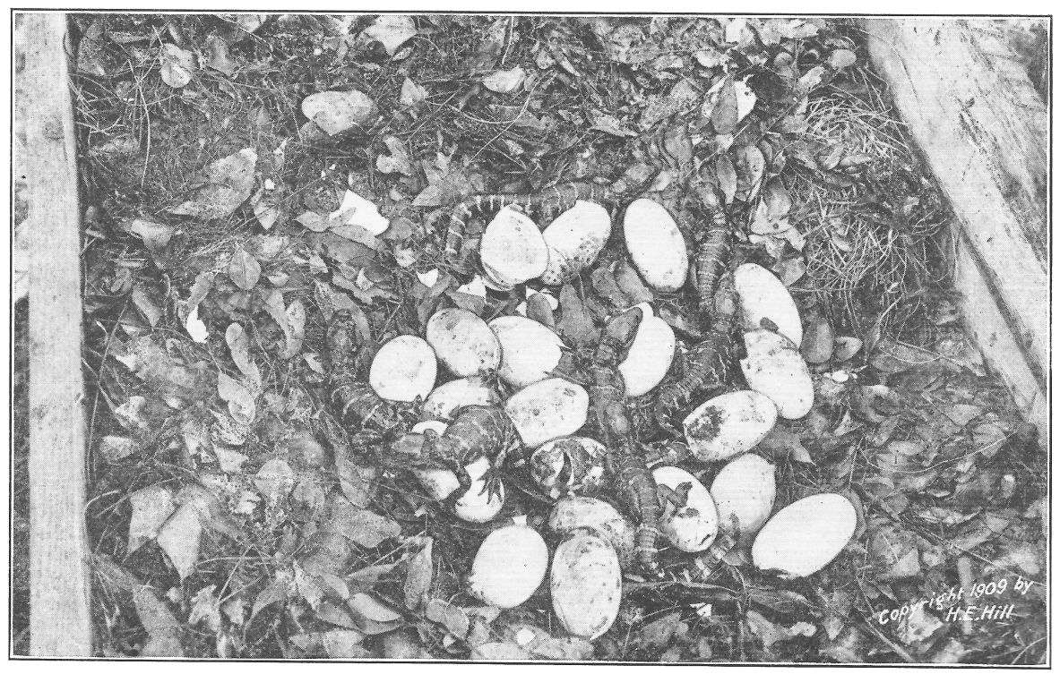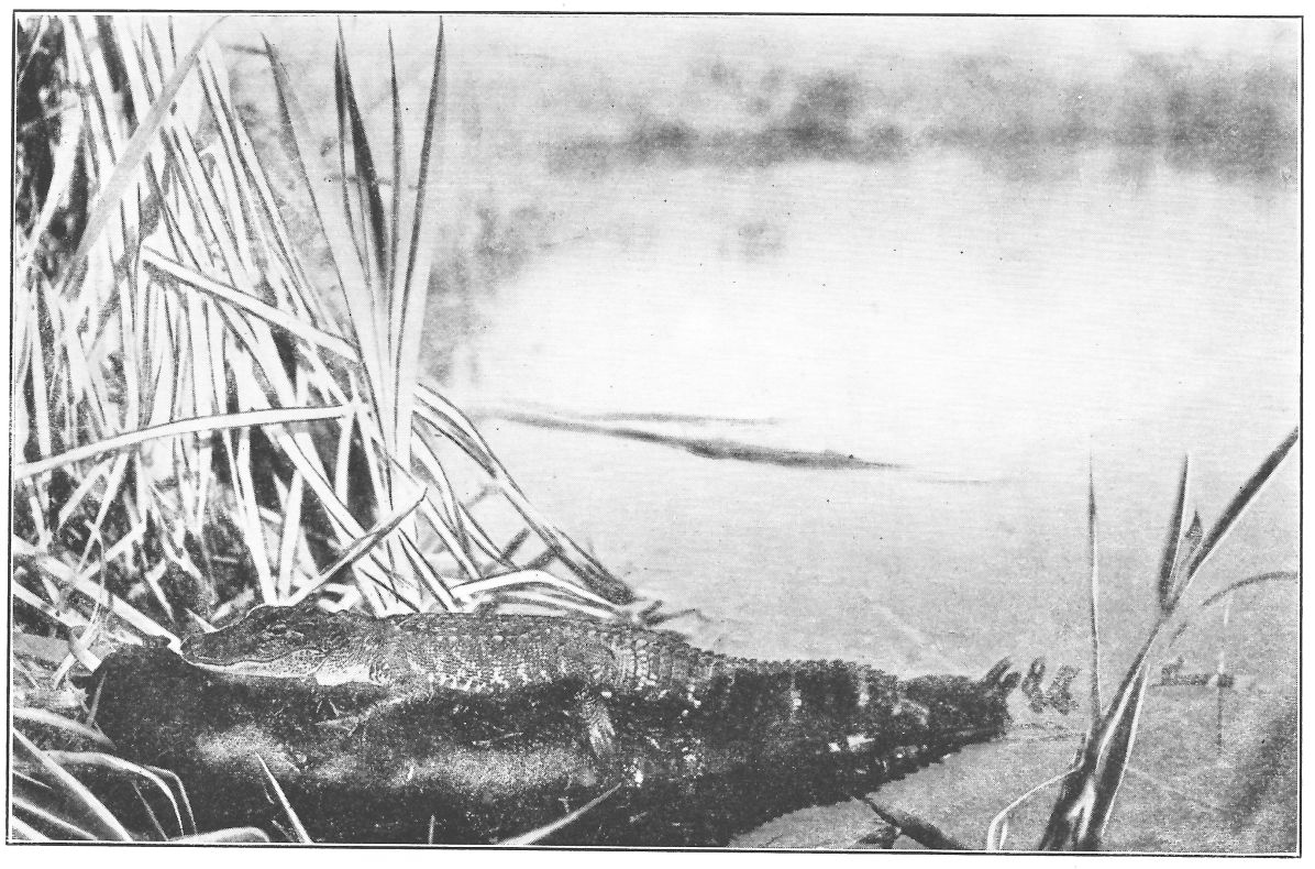 Then I saw a small green frog, one with a body an inch and a half long, whose hind leg was caught beneath the water hyacinths. He it was that was giving these most human-like little screeches. Almost I reached to disentangle his foot with my finger. Then I bethought me what country I was in and poked with the handle of a net that I had with me, instead. This was just as well, for the poking disclosed the arrow-shaped head and baleful eyes of a young water moccasin. A blow or two broke his hold on the frog, that stopped his yelling forthwith and hopped eagerly away. The snake was soon despatched. He was only nine inches long, and how he hoped to swallow a frog so big I cannot say. Common report says he could stretch his rubber neck four times its usual size and accomplish his dinner.