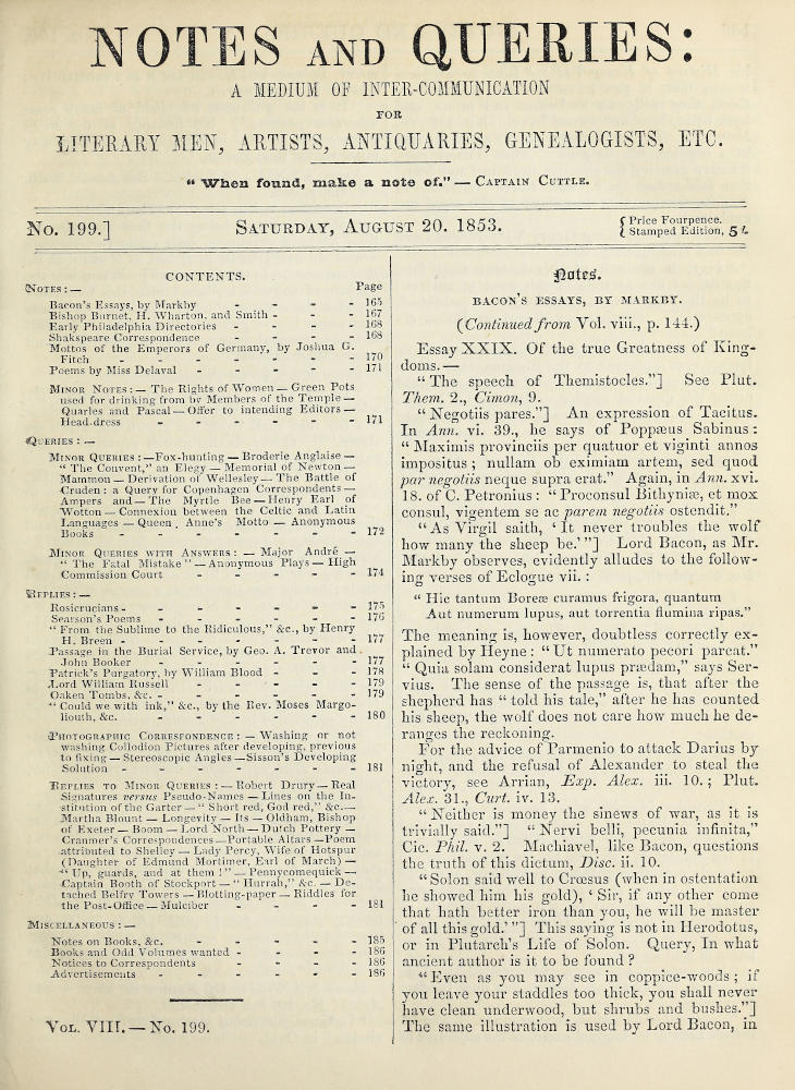 | Replies to Minor Queries:—Robert Drury—Real Signatures versus Pseudo-Names—Lines on the Institution of the Garter—"Short red, God red," &c.—Martha Blount—Longevity—Its—Oldham, Bishop of Exeter—Boom—Lord North—Dutch Pottery—Cranmer's Correspondences—Portable Altars—Poem attributed to Shelley—Lady Percy, Wife of Hotspur (Daughter of Edmund Mortimer, Earl of March)—"Up, guards, and at them!"—Pennycomequick—Captain Booth of Stockport—"Hurrah," &c.—Detached Belfry Towers—Blotting-paper—Riddles for the Post-Office—Mulciber | 181 |