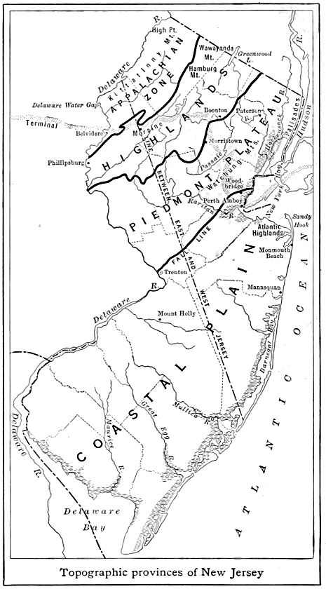 In a general way the surface of New Jersey may be described as mountainous in the northern part, undulating in the middle part, and low and sandy in the southern part. The state is divided into four provinces or zones; namely, the Appalachian zone, the Highlands, the Piedmont Plateau, and the Coastal Plain. These zones extend from southwest to northeast.
