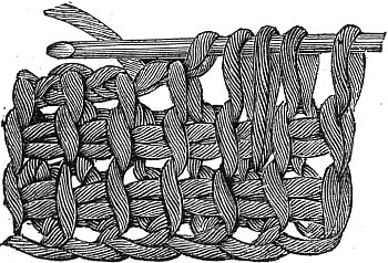 1st row—still keeping the loop on the needle—miss the 1st chain stitch, put the needle into the next chain stitch, take up the wool on the needle and draw it through in a loop; * keep the two loops on the needle, put the needle into the next chain stitch and repeat from * to the end of the chain. This is termed “raising” loops or stitches, and there should be as many loops on the needle as the foundation chain.