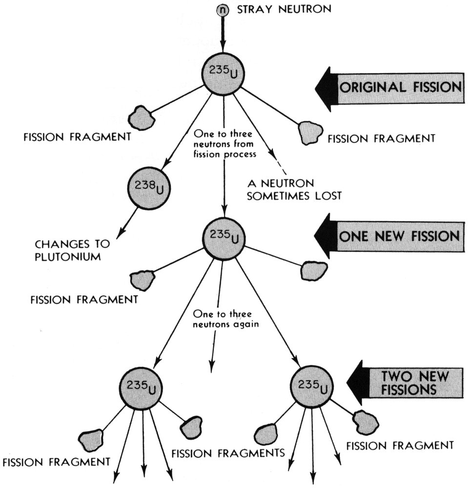 The first large-scale application of thermonuclear energy was the so-called hydrogen bomb, or “H-bomb.” For a brief time an exploding fission bomb develops a temperature 28 of hundreds of millions of degrees Fahrenheit, hot enough to cause some light nuclei to fuse. In the hydrogen bomb, light nuclei of deuterium and/or tritium are exposed to this temperature during such a fission explosion. The resulting fusion of these nuclei causes the explosion to be hundreds of times more powerful than that of the fission device alone. In 1952 the Atomic Energy Commission test-fired such a thermonuclear device at Eniwetok Atoll in the Pacific Ocean. The energy released by the highly efficient device produced an explosion that completely destroyed the coral islet where it was detonated.