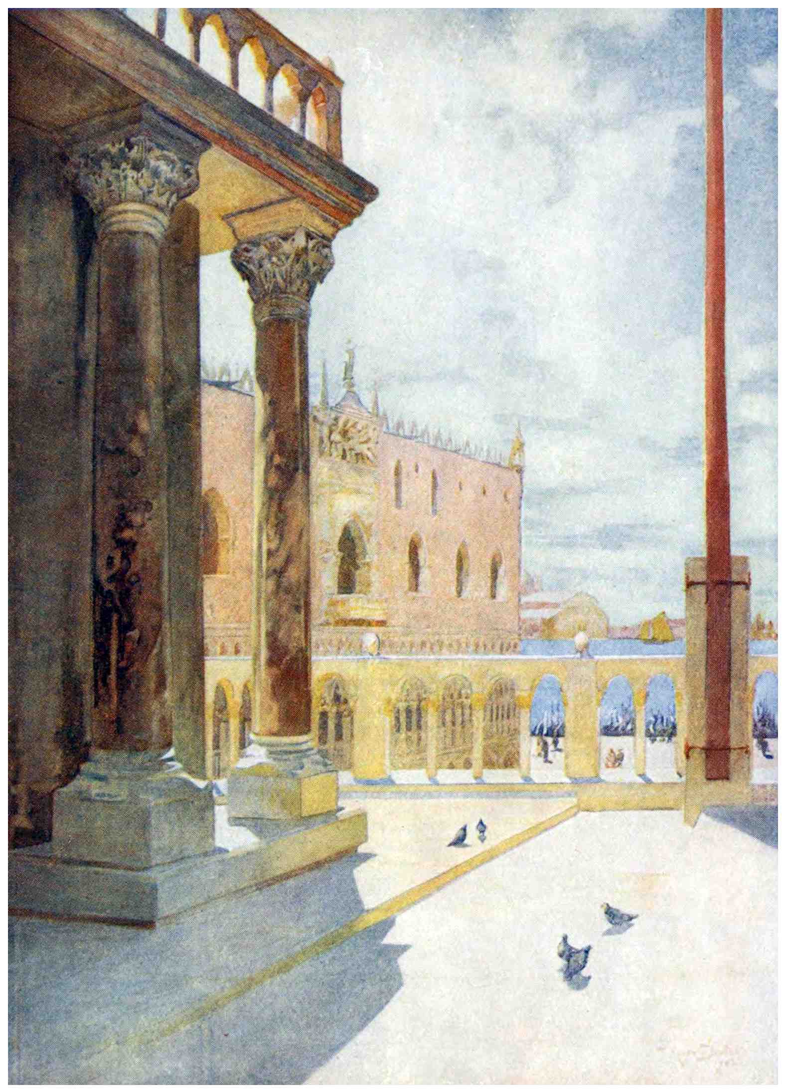 The Ponte Canonica, which adjoins our first Capello Palace, now allows us an easy passage, and we can take our way on the ebbing tide down the Rio del Palazzo. Below the sombre weight of252 the Bridge of Sighs, between the palace and the prison, we pass again into the aureole of Venice. Within the brilliant bay formed by the Riva degli Schiavoni the gulls are making festa, and away towards the city they whirl and drift like shining snowflakes in the radiance of the Grand Canal. As we pass the Piazzetta to land at the Molo, the golden sword of Justice gleams superbly luminous in the blue above San Marco. Venice has put on her glory.