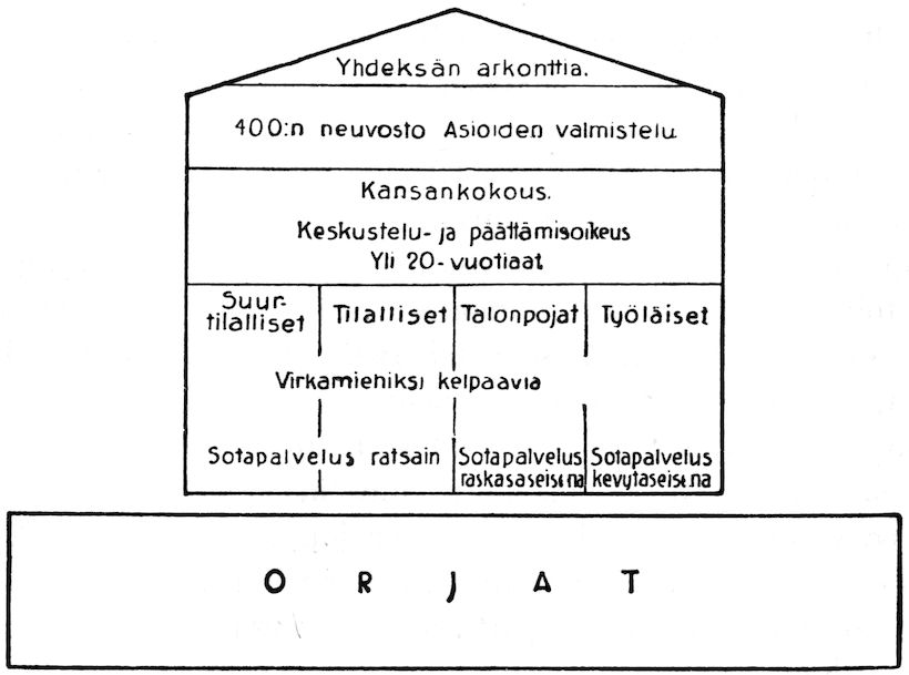 Mitä muutoin esitystapaan tulee, olemme koettaneet tarkoin, vaikka lyhyesti selittää kaikki esille tulleet historialliset käsitteet, jottei oppilas jäisi epätietoiseksi siitä, mitä milläkin sanalla ymmärretään. Opettajan asia on tietenkin antaa lisäselityksiä, milloin ne osoittautuvat tarpeellisiksi.
