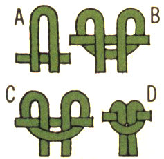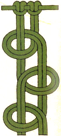 Take 2 strands of A, each 2½ yds. long, twist tightly, fold in half and let twist itself. Knot each end.