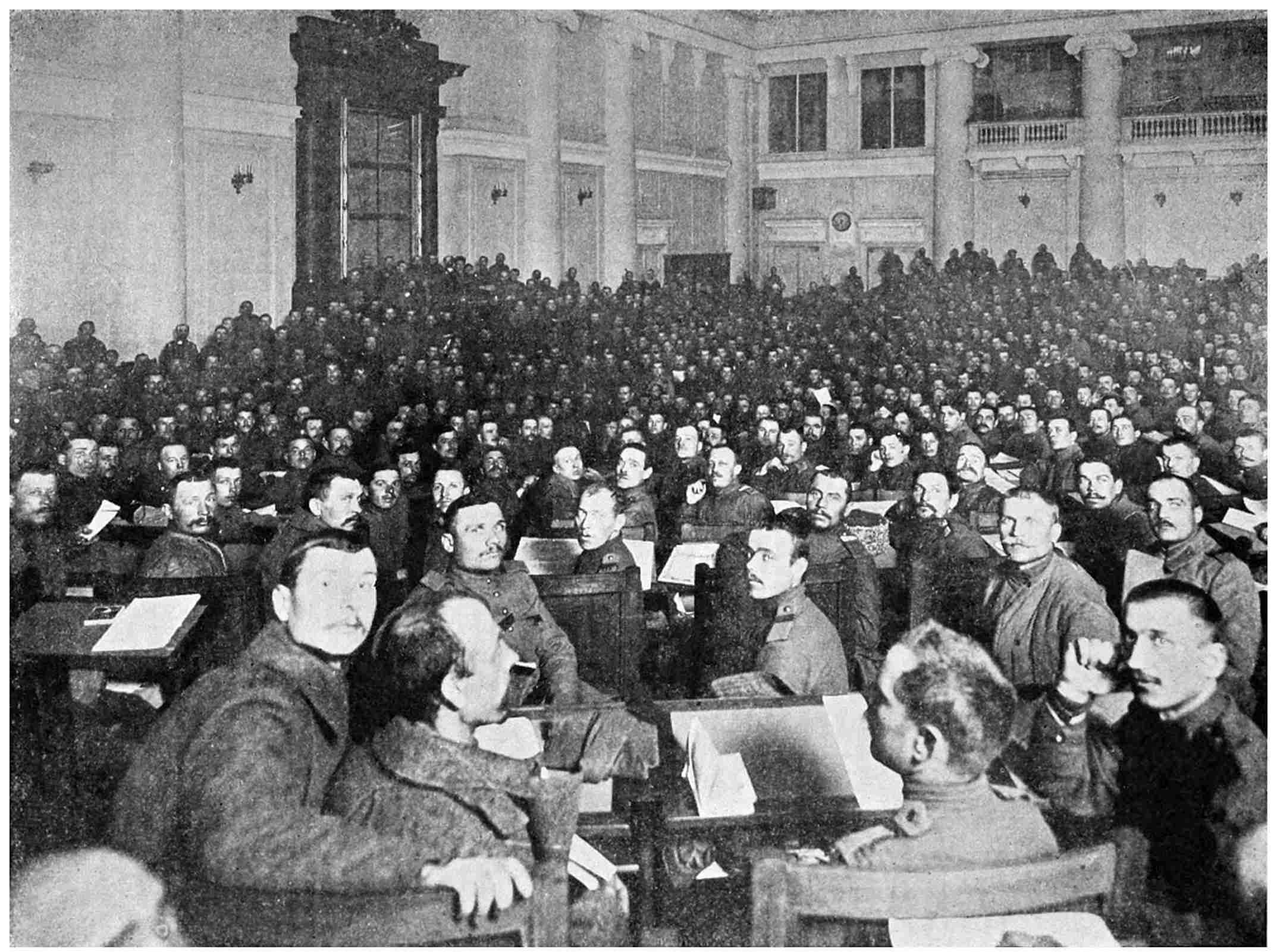 The first thing that was done by the Duma was to refuse to disperse and to resist the ukaze of the Czar that had prorogued its debates for an indefinite time. The socialist deputies went about trying to get the population of Petrograd to join in the vast movement of revolt they meant to bring about. The latter was but too willing to do so, and the want of provisions was the pretext which the people took to organise vast meetings, and a strike in all the factories. Great masses of men and women paraded the streets, and were dispersed by a formidable police force which had been assembled by Mr. Protopopoff and armed with machine guns that were used against the crowds, whenever these did not obey immediately the injunctions to disperse given to them by special constables and Cossacks gathered together in all the principal streets and squares of the capital. The regular279 troops had been consigned in their barracks and ordered to keep themselves ready to lend a hand to the police. But the unexpected happened. The soldiers had been worked upon by delegates from the workmen, and they declared that they would not obey orders, should any be given to them, to fire upon the populace assembled in the streets. The latter seemed quite sure of impunity, because notwithstanding the preparations made by the police to quell the revolutionary movement, the existence of which was already recognised everywhere, it refused to disperse, and on the contrary proceeded to commit the only acts of violence which were performed during the course of the mutiny. It threw itself on the prisons where political offenders were confined, plundered and burned them, and liberated their inmates. A few other excesses were performed, upon which the Duma constituted itself an executive committee, which assumed the task of restoring order in Petrograd.
