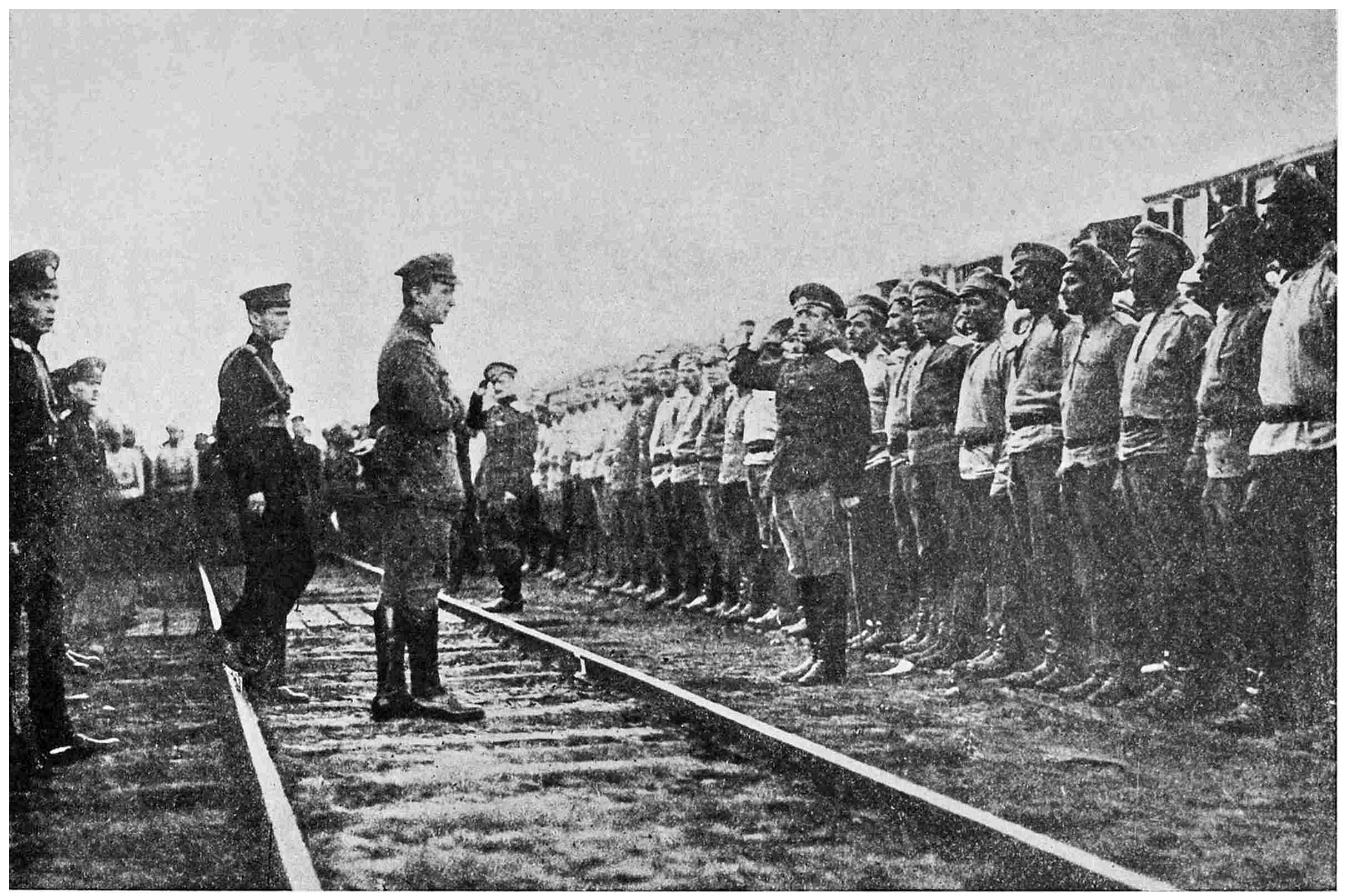 On the platform were standing several officers who had formerly been attached to the person of the Emperor, whilst he had been in command of the army. They were waiting to say good-bye to their former chief. A guard, no longer of honour alas! was also standing at the door of the railway compartment assigned to him, who a few days before had been the Czar of All the Russias, together with the commissioners of the Duma, into whose hands Alexieieff delivered his prisoner. Nicholas II. passed on from his298 mother’s train to his own. Every head was uncovered; he spoke to no one, and no one spoke. A silence akin to that of the grave prevailed. Standing at the window of her carriage could be seen the figure of the Empress Marie watching this sad departure. A few minutes later the train started on its mournful journey. Another act in this drama had come to an end.