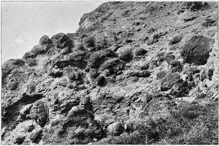 Owing to a change in the direction of strike the rocks now wheel round and for a time run nearly parallel with the coast-line, while they are partly concealed by blown sand and herbage. The shales and limestones just mentioned are not constant, and are soon lost, but about a quarter of a mile westward a band of tuff begins on the same horizon or near it, and increases in thickness towards the west, where it is associated with other sediments. The shore ceases to furnish a continuous section, so that recourse must be had to the craggy slopes immediately to the north, where the rocks can be examined on a cliff face (Fig. 153). There the tuff just referred to, together with some overlying bands of sandstone, is seen to pass under the group of basalts last enumerated. It is a green, stratified rock, perhaps 60 feet thick at its maximum, but dying out rapidly to north-west and south-east. It encloses balls of basalt and subangular and rounded fragments of sandstone, limestone and shale. A mass of coarse volcanic agglomerate which is connected with it and cuts across the ends of some of the basalts below, probably marks the position of the vent from which the tuff was ejected (Fig. 152).