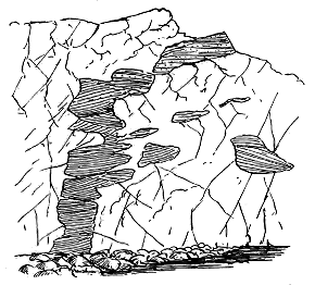 27. Basalt—the most striking of the whole section—a fine compact black olivine-bearing rock, beautifully columnar, 30 feet. The columns reach to within a foot of the bottom of the bed and cease about 10 feet from the top, the upper portion of the bed being massive, with vesicles which are drawn out parallel to the bedding of the series. The lowest part of the bed is a broken brecciated band, 3 or 4 inches thick. (See Fig. 171.)