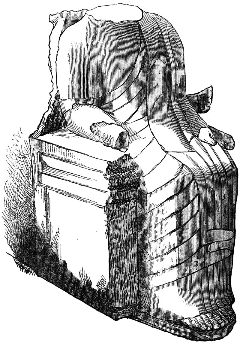 But the most interesting matter to us in connection with Ephesus have been Mr. Wood’s excavations there, with his discovery not only of many unexpected monuments of the ancient town, but of undoubted relics of the famous temple itself. Mr. Wood, as the constructing engineer of the Smyrna and Aidin Railway, had naturally become well acquainted with the neighbourhood of Ephesus, and, hence, so early as 1863, had made, at his own expense, some excavations, clearing out thereby the Odeum, and ascertaining the true position of the Magnesian and Coressian gates. In these researches, he met with several valuable inscriptions, one of them referring to a certain Roman, Publius Vedius Antoninus, who was at the time the γραμματεὺς—the Scribe or Town-clerk—of the city.[23] By degrees the position of the Theatre, the scene 42of the tumult at the time of St. Paul’s visit, was clearly made out; but where was the Temple? In the prosecution of his excavations Mr. Wood had, however, met with many decrees of the people of Ephesus relating to the Temple,—one of them containing much curious information about the ritual used in the Temple-worship, with lists of the votive offerings, to be carried on certain days in procession “through the Magnesian Gate to the Great Theatre, and thence back again through the Coressian Gate to the Temple.” Among the list of statues are several of Diana, probably, such as those which “Demetrius and his craftsmen” manufactured in the days of St. Paul.