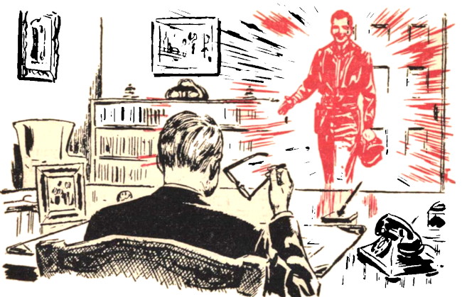 He had not long to wait. A moment later an odd red haze appeared in a far corner of the room. There was a crackling sound as of high-voltage electricity jumping its bounds. The phenomenon vanished as quickly as it had appeared and a young man was approaching the President's chair.