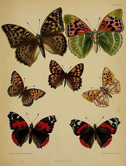 Mr. Scott Wilson, writing to the author of his visit to the Isle of Palma, states that the Queen of Spain Fritillary (Argynnis Lathonia) is very common in the meadows near the town of El Paso, 2000 feet above the sea level in May. In the same month he noticed the clouded yellow (Colias Edusa) in large numbers in the clearings amongst the pine-woods. A few specimens of the large Fritillary (Argynnis Maia) were secured by him at El Paso early in May, where the Vulcania was also found; of these latter specimens only two out of one hundred proved to be of the British form Atalanta. The Bath-white (Pieris Daplidice) was common near Argual.