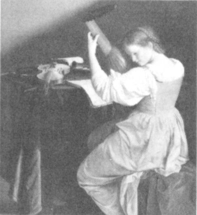 The most casual elements of this intimate portrait of human activity combine to create a masterful composition of complex and dynamic parts. The pose of the girl, shown with arm and head poised as she tunes her lute, generates a feeling of sustained movement. The intricate still life fading into shadowy depths at the left is in deliberate contrast to the brightly lit costume and solid figure of the lute player. The combination of abrupt spotlighting and suggested deep space was characteristic of baroque painting in seventeenth-century Rome, and Gentileschi, an international court artist, transmitted this robust style to Genoa, Paris, and London.