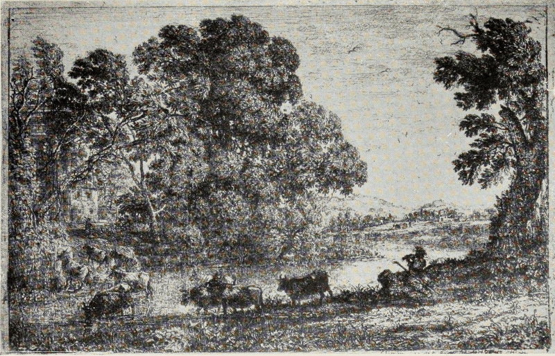 In etching his method is as personal as in his painting. He entirely disregards all the accepted canons of the art. Line, as line, hardly exists in his plates; it is scribble, scribble, everywhere. The tree trunks, the rocks, foreground and distance, often the foliage itself, all are as “wrong as wrong can be,” so far as accurate representation is concerned. Yet Corot, great artist and great nature poet, can transgress every rule and still succeed in conveying his message. In the best of his etchings he does succeed admirably. Souvenir of Italy and Environs of Rome of 1865 (Corot was then nearly seventy years of age) are among the most interesting prints of the period. In these plates, and others like them, Corot has given free rein to his poetic and imaginative powers and has drawn upon his memory of the [Pg 263]Italy of his youth. In method, in their disregard of line, form and texture, they are shining examples of what etching should not be. In decorative quality, poetic suggestion, and sentiment they are altogether delightful.