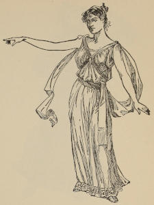Maiden.—Loose, white robe, wing-like sleeves, displaying arm; hair long, loose, and flowing over shoulders.