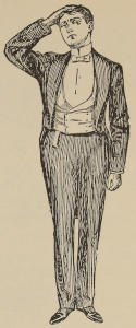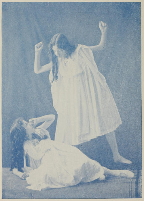 The scene is a parlor.—Standing in the foreground is a young girl, simply dressed. In her left hand she has a rose, and holding out her right hand shows to her companion the scratches made by the thorns (a little carmine paint, put on with a fine camel’s-hair pencil, makes very painless scratches.) Her companion, a young man dressed as a mechanic’s apprentice (a carpenter’s, butcher’s, shoemaker’s or any other trade), is, with a look of sympathy, raising the wounded hand to his lips. Behind the young man stands his employer, with an expression of rage, raising a rope about to strike the apprentice. He is not perceived by either of the young people.
