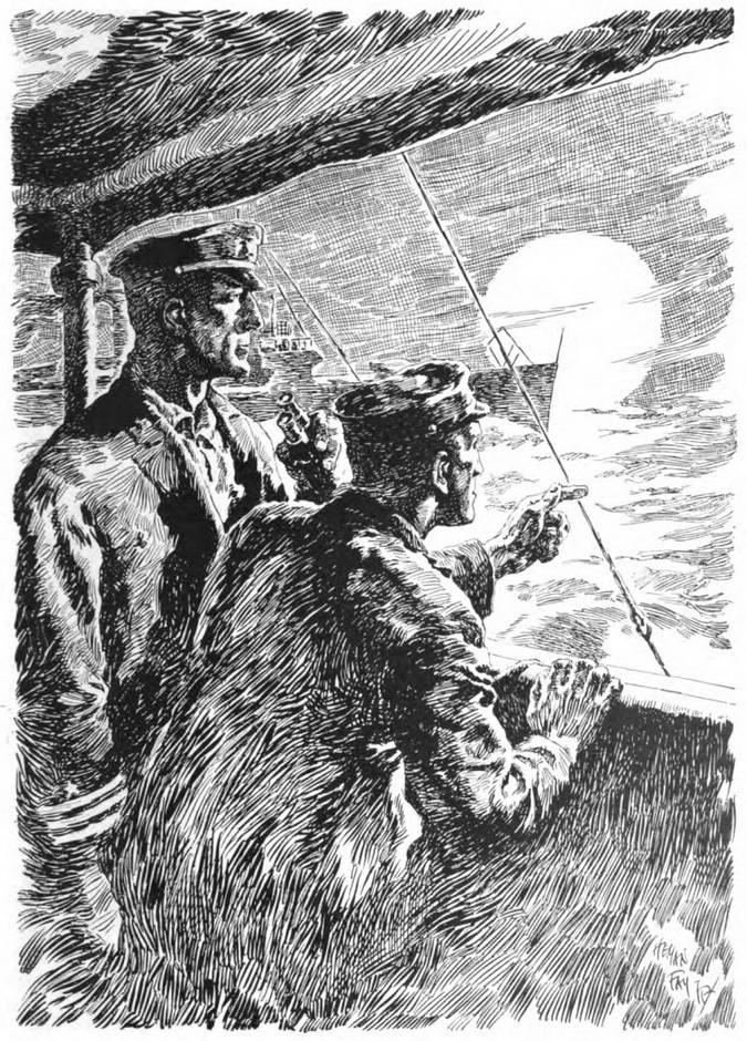 Descending the basket mast, he shouted to Captain Fraser as he passed the conning tower, “All ready to use,” and hastened below to the radio room where he found the generator already humming again at its task of supplying the power to carry the voice from the conning tower far over the turbulent waters. And as he watched the metres on the panel he knew that the transmitter was again carrying the messages that were directing the work of the fleet. But his heart was sick with the haunting picture of the flame shooting from Lindsay’s turret.