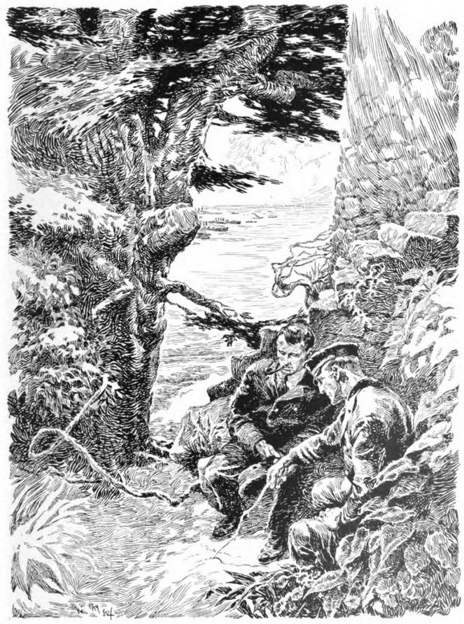Into such a bay, as the gorgeous summer afternoon drew to a close, the Petrel steered her course, her sails beginning to droop as the breeze gave way to the calm of evening. Two happy men sat lazily in her cockpit gazing over the placid water into the enchanted forest that lined the shore ahead of them. Through the day, while bounding over the sparkling blue waves, their talk had drifted on, as the spirit moved them, from one phase of the war to another. Evans delighted Mortimer with his pictures of the life in the navy and sidelights on the various admirals and others who had figured in the official doings. He told of his talk with Fraser in the Borge garden and the conferences that followed—tales which never reached another mortal ear.