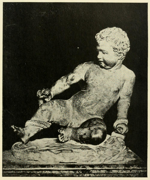 You are probably wondering by this time how all this vast array of myths has come down to us from the long ago past. Much of it has been preserved in ancient books like the “Rig Veda” in India, which is thought to be about four thousand years old, the “Iliad” and “Odyssey” of Homer in Greece, about three thousand years old and many others.[38] These books existed in manuscript for many hundreds of years. Since the invention of printing, large numbers of them have been printed and translated into modern languages. Knowledge of ancient myths has also been obtained from monuments and the inscriptions upon them, from paintings on vases and from statues.